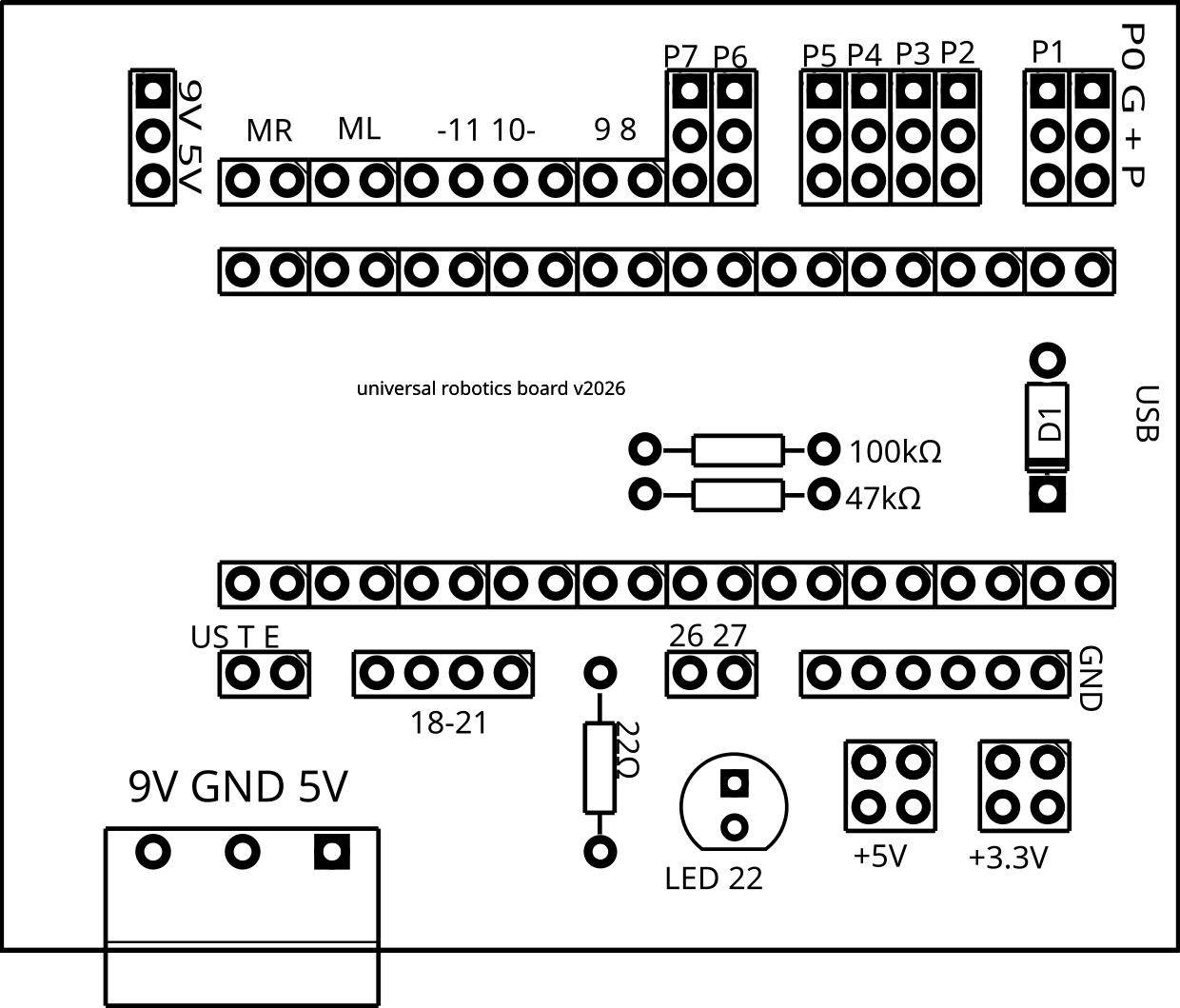 Statt eines Steckbretts kann nun auch eine Platine, das universal robotics board (urb) genutzt werden. Auf der Platine finden sich geeignete Anschlüsse sowohl für den Theo III als auch für die Laufroboter. Damit gibt es weniger Kabelsalat.